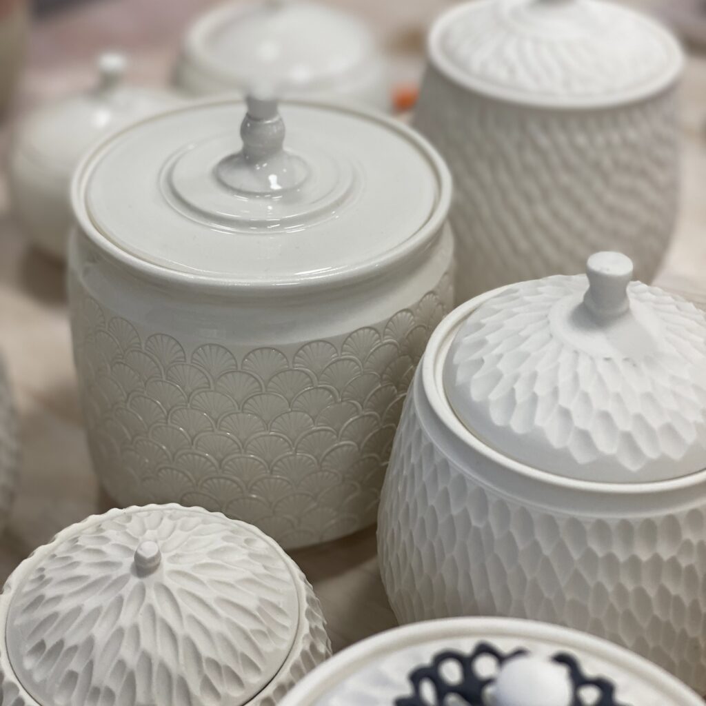 Angélique aime aussi jouer avec les textures, sculptant, perforant et allégeant ses céramiques pour créer des reliefs subtils, qui captent la lumière et transforment l’objet en une pièce unique. Qu’elles soient en porcelaine ou en grès, ses créations forment un ensemble harmonieux, où chaque détail est pensé pour sublimer l’ensemble.