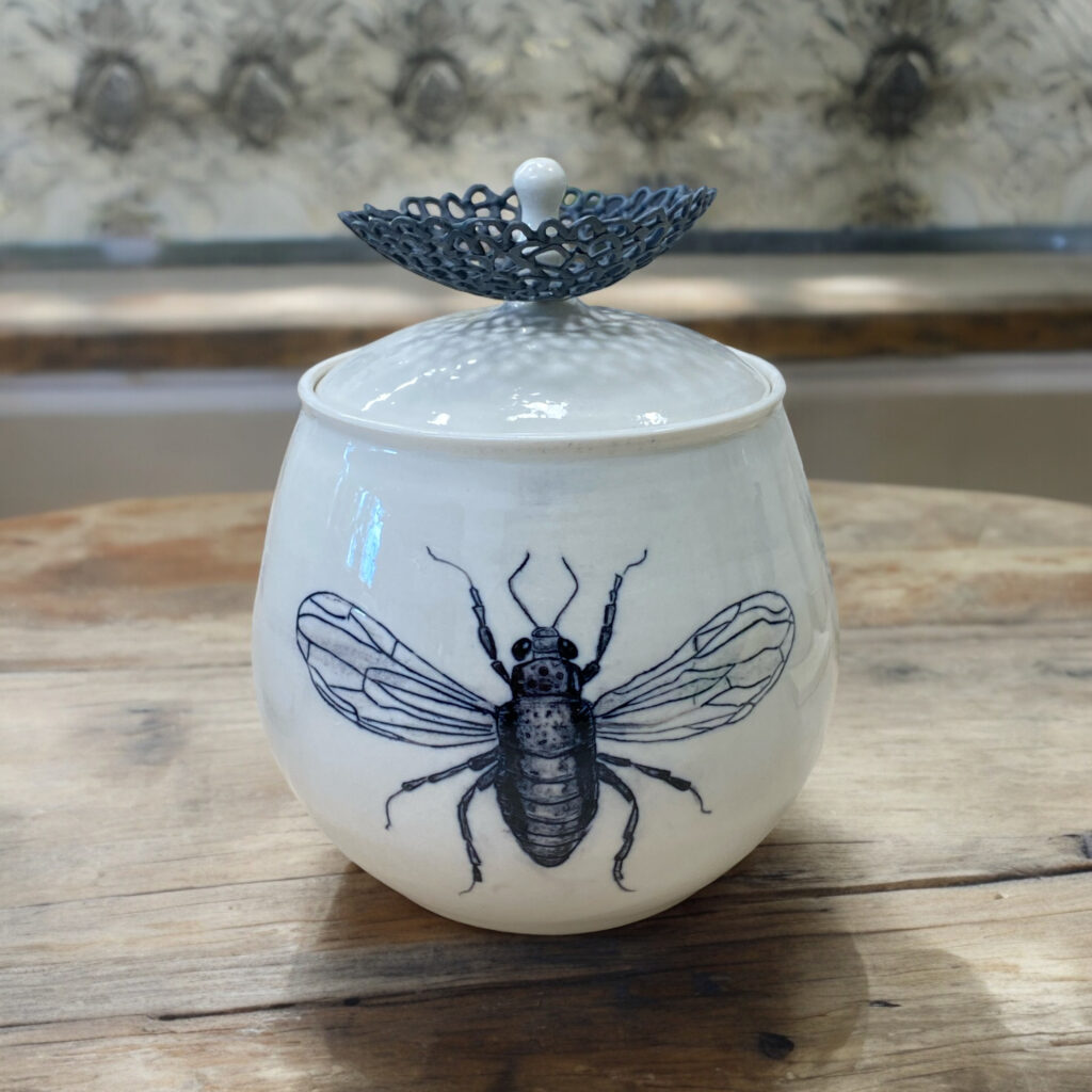Les pièces réalisées à l’atelier Angélique Boscher sont le résultat d’un travail minutieux de façonnage et de décoration. Certaines de ses céramiques, en porcelaine, célèbrent la beauté des insectes et autres éléments naturels. Ces pièces sont ornées de motifs délicatement gravés à l’aiguille, offrant une précision et une grande finesse.